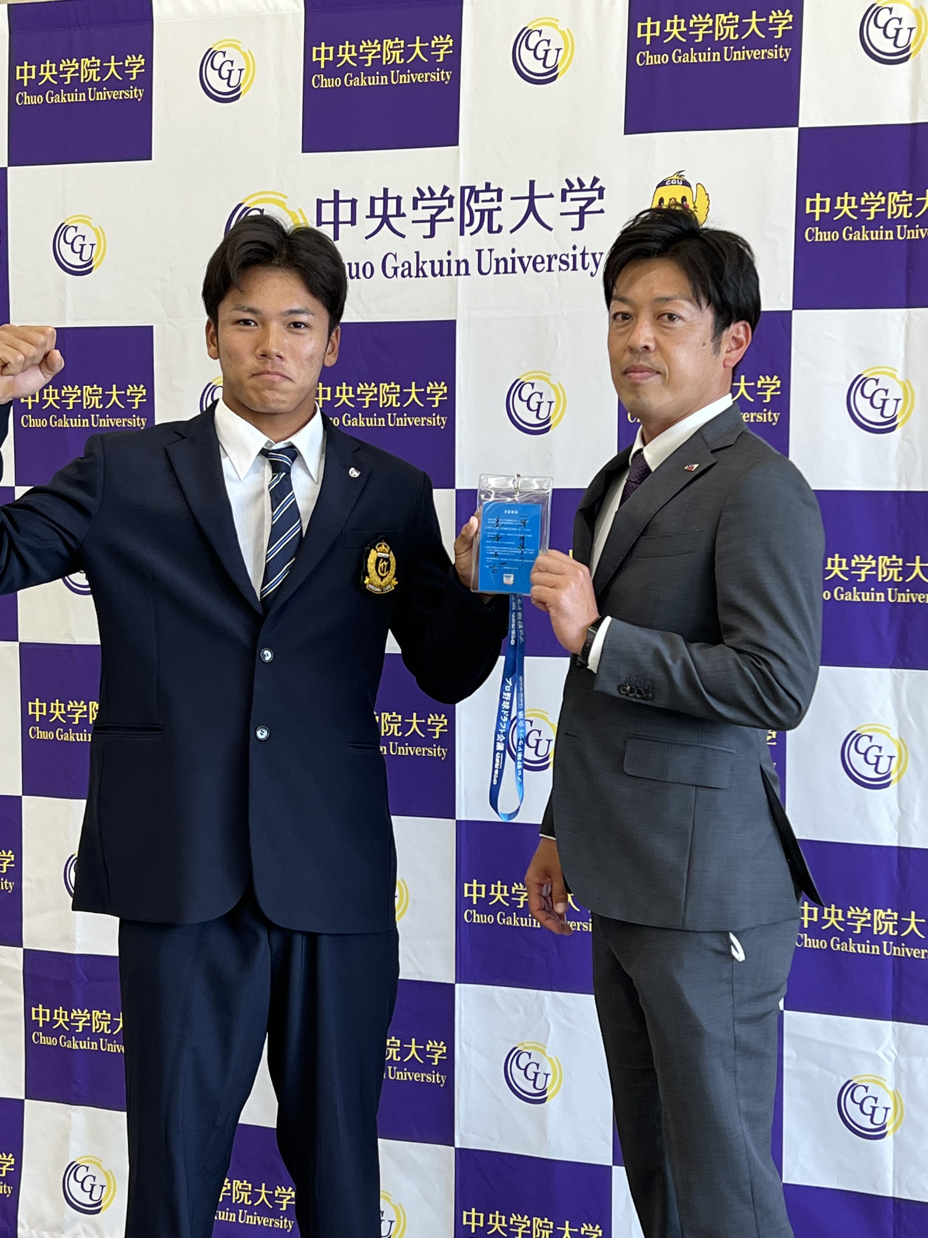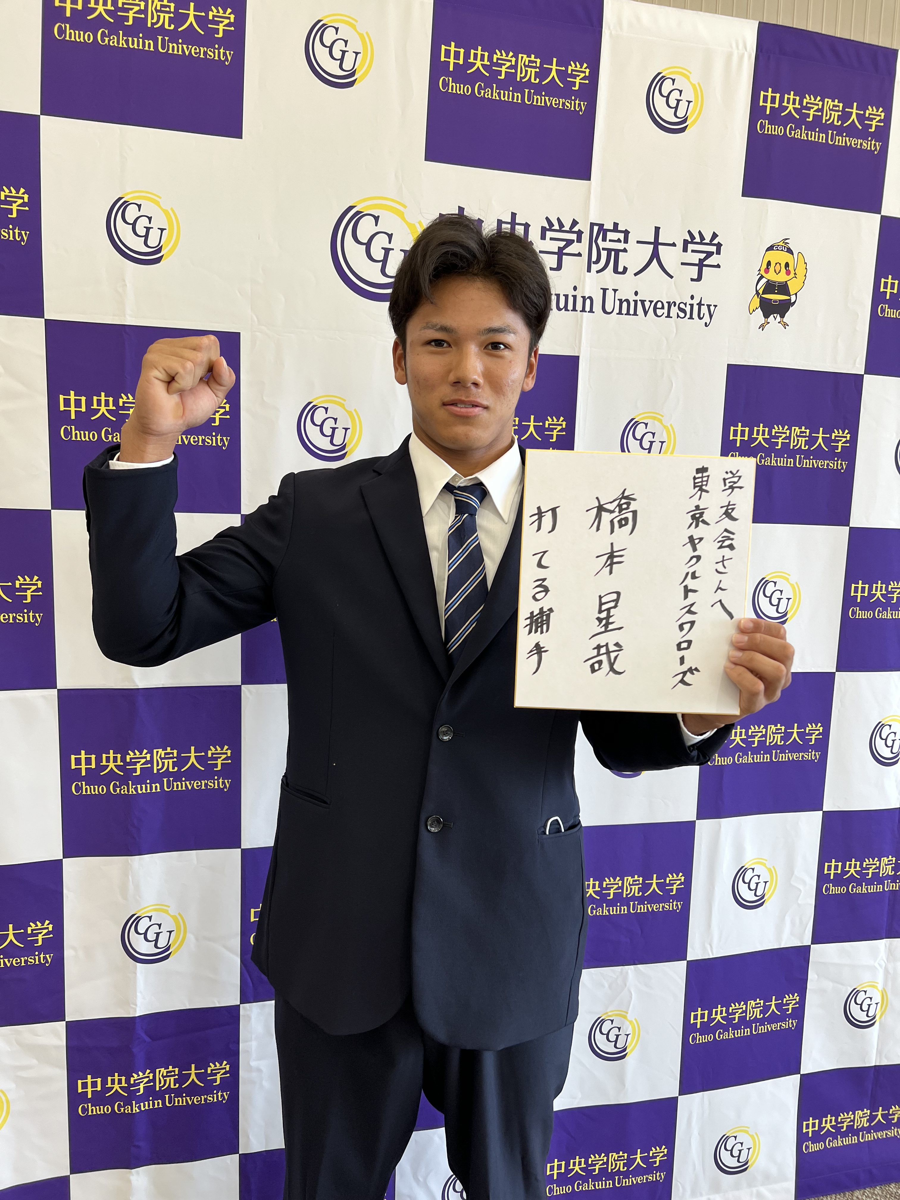 2022年10月26日(水)、東京ヤクルトスワローズの球団関係者が来校され、プロ野球ドラフト会議で同球団から育成1位で指名された本学硬式野球部の橋本 星哉選手(商学部4年)が指名の挨拶を受けました。