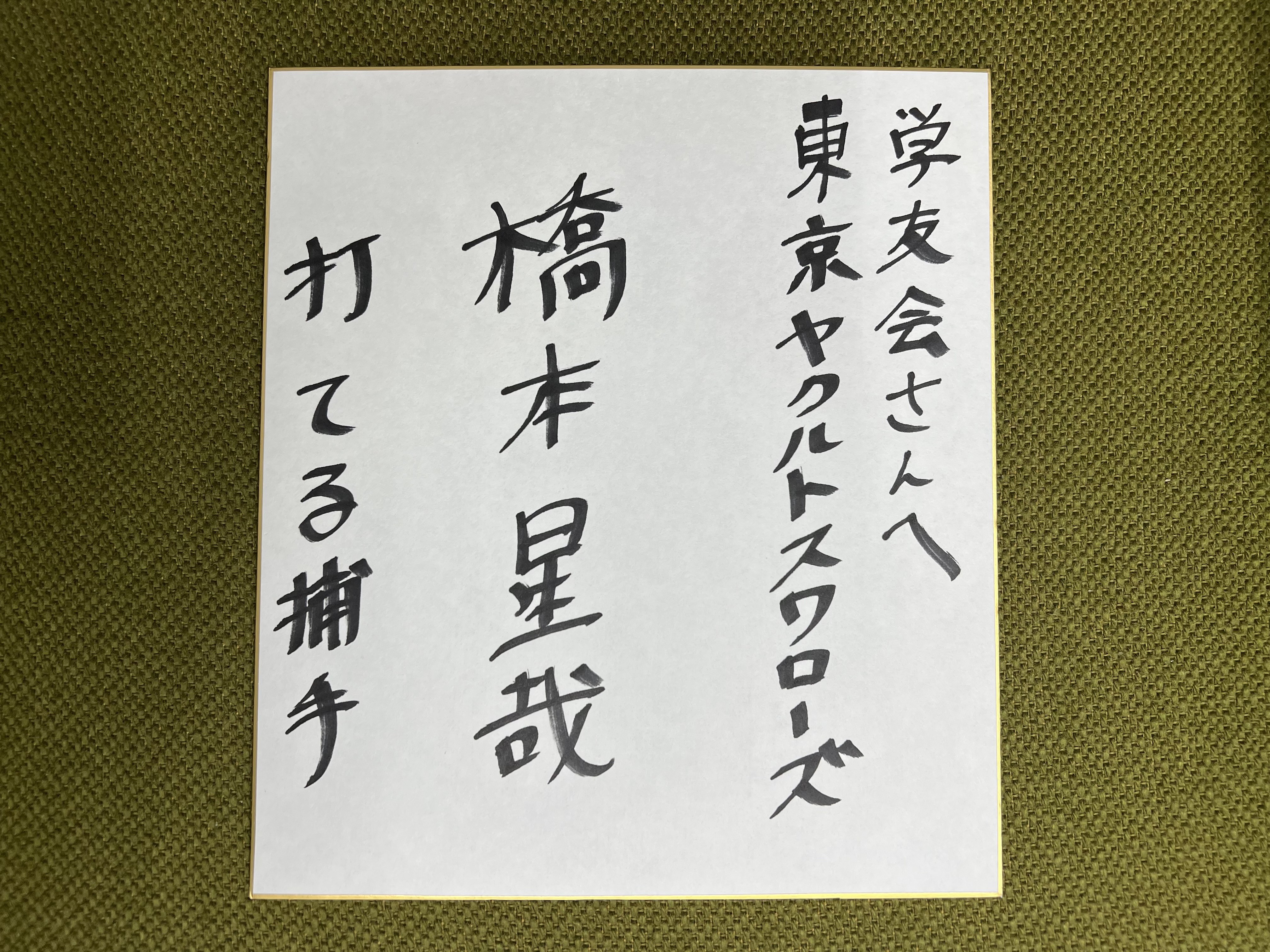 挨拶の場では、高津監督の直筆で「一緒に頑張ろう!」とメッセージが書かれたドラフト会議の通行証を受け取り、「強いチームに評価していただいてすごく嬉しい。怪我をしない体づくりをして支配下にできるだけ早くあがりたいです」と緊張した面持ちで意気込みを語り、写真撮影にも対応していました。特別に学友会に対しても、写真撮影とサイン対応してくださいました!